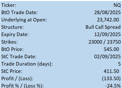 I didn't get a confirmation of strength in this position and the sell-off overnight has passed my Stop Loss on this one, so I've closed early with 24.5% loss over 5 days.