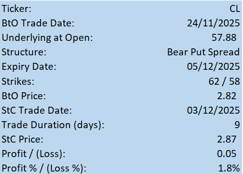 Trade #15: Bear Put Spread in oil closed with a small profit