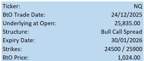 Not a breakout but a swing trade just before Christmas to capture a move upwards in Nasdaq early in 2026. I expect to adjust this one during January if conditions permit.