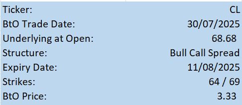 Trade# 8: Bull Call Spread to capture move upwards in Oil price Andy McDonald 31 Jul 2025 I opened a position in oil on NYMEX yesterday after a breakout to the upside.